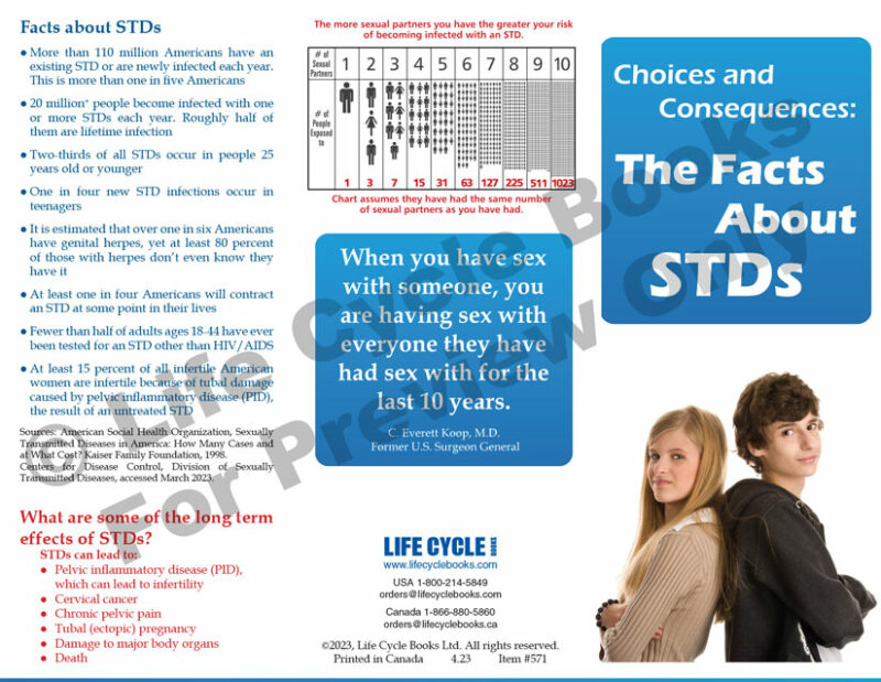 This brochure clearly outlines what teens need to know about STDs and the dangers of sex outside of a faithful lifetime commitment (i.e. marriage) to a partner who is STD free. Includes basic information about STDs including the types, the number of different STDs; how many people are infected; symptoms, treatment, and long term effects. Also includes a Q & A section as well as a chart showing how your risk for STDs dramatically increases with the number of sexual partners you have.