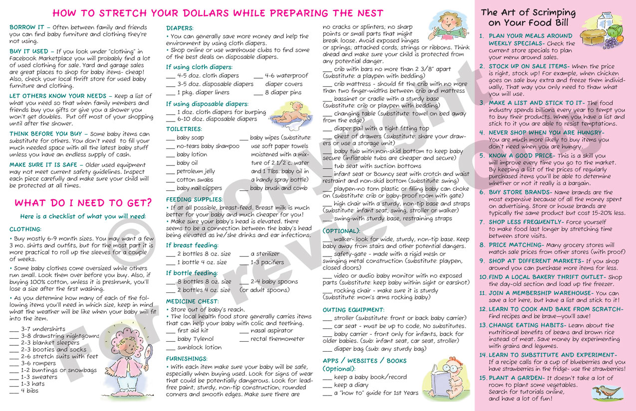 An important part of your client’s pregnancy is helping her get ready for the baby’s arrival and thinking through the financial responsibilities. This extremely helpful brochure will assist in setting up a monthly budget as well as give her some practical ideas for saving money. It also comes with a handy checklist of baby items that she will want to consider collecting before the big day.